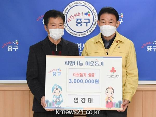 ▲ 사진=대전광역시대전 중구(구청장 박용갑)는 6일 임경태 거리연주가로부터 이웃돕기 성금 300만원을 기탁 받았다고 밝혔다.