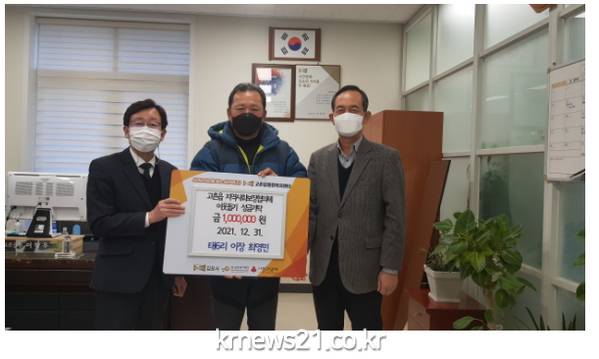▲ 사진=김포시고촌읍 태6리 최영민이장이 지난 12월 31일 고촌읍지역사회보장협의체(공공위원장 이창우, 민간위원장 김시동)에 성금 100만 원을 기탁했다.