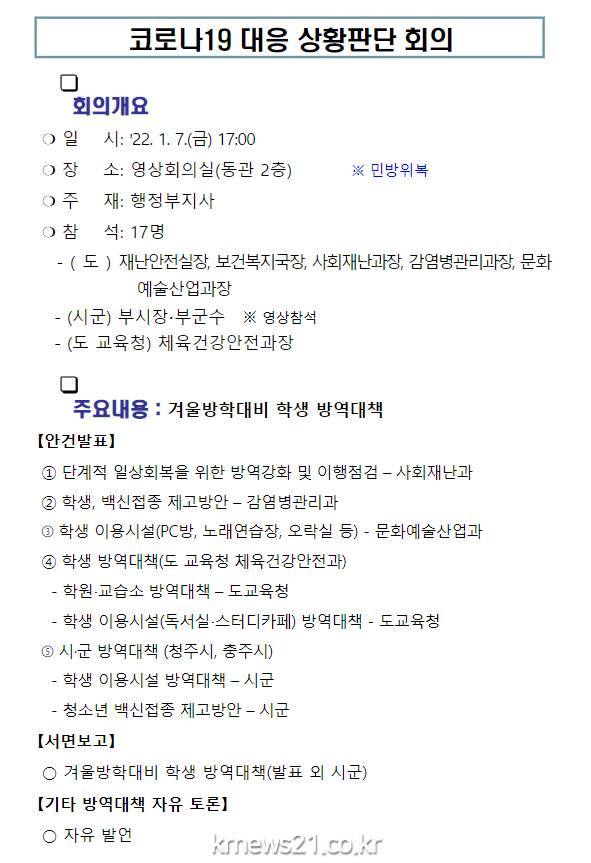 ▲ 사진=충청북도청충청북도는 1월 7일(17시), 도내 시‧군, 도교육청과 함께 코로나19 상황판단회의를 열어 코로나19 방역상황을 점검하고, 겨울방학과 설 연휴 기간 다중이용시설 방역실태 점검과 백신 접종률 제고 방안 등을 논의했다.