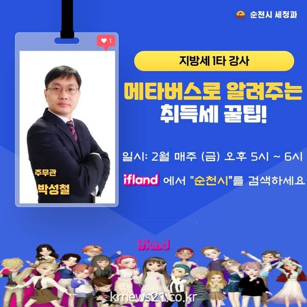 시는 가상세계에서 현실과 같은 경제적, 사회적, 문화적 활동을 할 수 있는 메타버스 플랫폼을 활용하여 시민들을 대상으로 ‘순천시가 알려주는 취득세 꿀팁 가이드’강연을 진행한다.