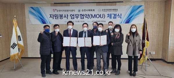 순천시자원봉사센터(센터장 문응연), 순천시체육회(회장 이상대), 순천시장애인체육회(상임 부회장 안운봉)는 오는 4월과 5월 순천에서 열리는 전라남도체육대회 및 전라남도장애인체육대회의 성공개최를 위한 업무협약을 체결했다.