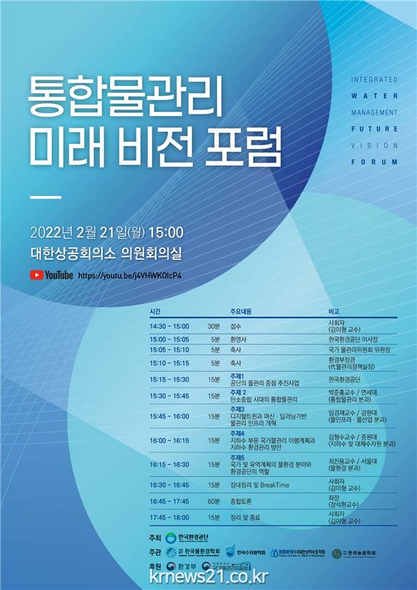 이날 토론회에는 안병옥 한국환경공단 이사장, 허재영 국가물관리위원회 위원장, 이영기 환경부 물관리정책실장을 비롯해 포럼위원, 분야별 전문가 등이 대면과 비대면 방식으로 참석할 예정이다.