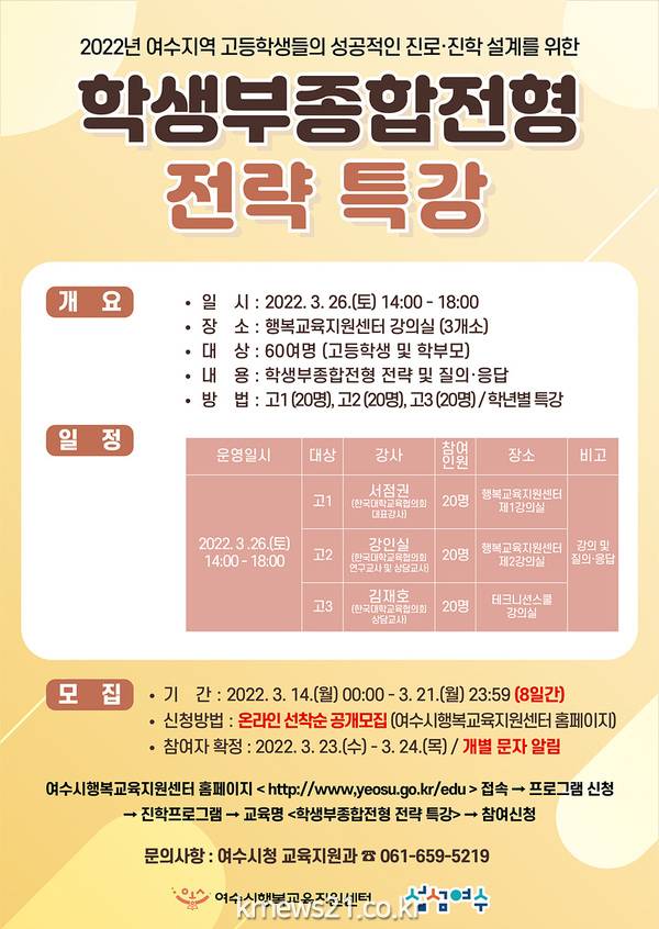 이번 특강은 3월 26일 오후 2시 여수시행복교육지원센터에서 열리며, 한국대학교육협의회 대표강사 3명을 초빙해 개편된 대입전형에 맞춘 학생부종합전형 전략에 대해 강의가 진행된다.