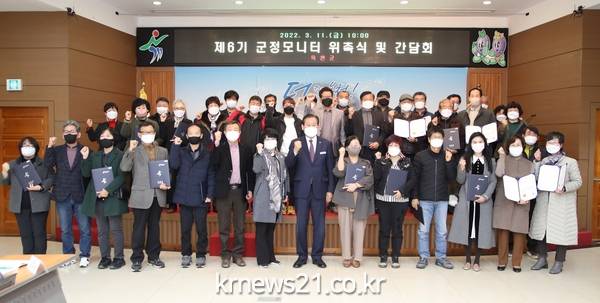 군은 지난 11일‘제6기 군정모니터 위촉식 및 간담회’를 통해 50명의 군정모니터 요원을 위촉하고 간담회에서 군정모니터 운영계획을 소개하며 추후 활동에 대해 논의하였다.