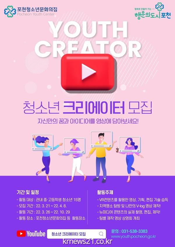 ○ 제공부서: 교육지원과 청소년활동팀 김신영 ☎031)538-3383 ○ 사진있음: 포천시 청소년 크리에이터 모집