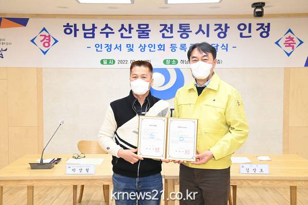 하남시(시장 김상호)는 24일 시청에서 김상호 시장과 하남수산물시장 관계자 등이 참석한 가운데 박상철 상인회장에게 전통시장 인증서와 상인회 등록증을 전달했다고 밝혔다.