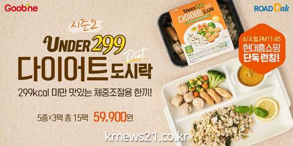 ▲ 사진=굽네닭컴 제공굽네 기술로 만든 맛있고 건강한 닭가슴살 전문몰 굽네닭컴(대표 박상면)이 새로운 반찬으로 구성한 ‘언더 299 다이어트 도시락 시즌 2’ 5종을 현대홈쇼핑에서 단독 론칭한다고 4일 밝혔다.