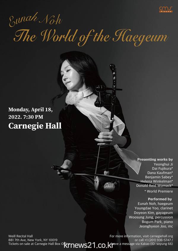 ▲ 사진=노은아 해금연주자 제공노은아 해금연주자는 오는 2022년 4월 18일(월) 저녁 7시 30분 미국 뉴욕의 카네기홀에서 "The World of the Haegeum" 타이틀로 독주 공연을 진행한다. 1972년 지영희 해금 명인이 카네기홀에서 공연을 한 지 정확히 50년만으로 지영희 명인은 당대의 명인 성금련, 김소희, 김윤덕과 함께 1972년 카네기홀 무대에서 우리의 음악을 세계인들에게 널리 알린 바 있다. 지영희 명인 이후 해금연주자로 카네기홀에서의 해금독주회는 최초이다.