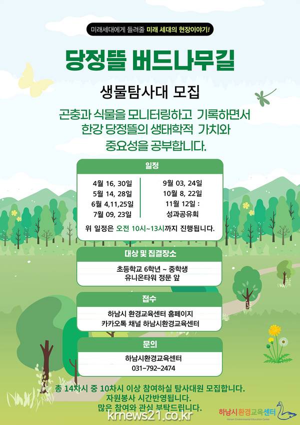 하남시에서 위탁 운영하고 있는 하남시환경교육센터는 오는 15일까지 ‘당정뜰 버드나무길 생물탐사대’를 모집한다고 밝혔다.