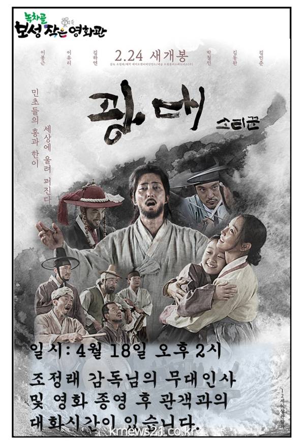 ‘광대:소리꾼’은 판소리를 주제로 한 영화이며, 2020년 개봉된 작품이다. 보성작은영화관에서는 감독판을 재개봉한다. 감독판은 민초들의 소리가 세상을 바꾼다는 최초 기획 의도를 더 깊게 반영해 만들어졌다.