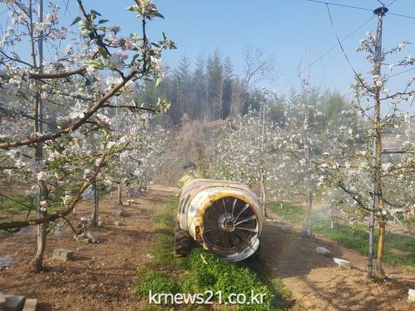 옥천군농업기술센터(소장 이재창)는 과수화상병 예방과 확산 방지를 위해 사과, 배 재배 농가를 대상으로 개화기 약제살포에 적극적인 참여를 당부했다.
