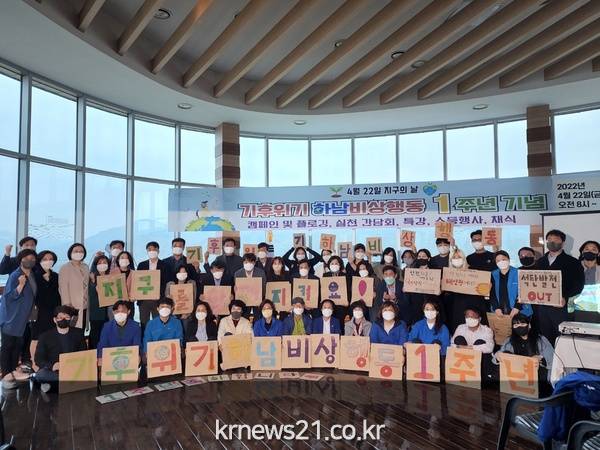 기후위기 하남비상행동(공동상임대표 홍미라·서정화·박향자·조재영·조혜연)은 제52회 지구의 날을 맞이하여 4월 22일(금) 시민들과 함께 관내 곳곳에서 플로깅(조깅을 하면서 쓰레기를 줍는 새로운 개념의 운동)을 진행한 후 유니온타워 4층 전망대에서 1주년 기념식을 진행하였다.