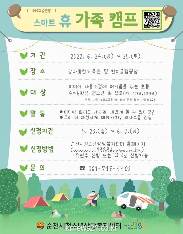 순천시는 오는 6월 24일부터 25일까지 1박 2일간 상사종합체육관 및 천지글램핑장에서 미디어 사용조절에 어려움을 겪는 초등 4~6학년 청소년과 부모 10가정을 대상으로 순천형 스마트 휴 가족캠프를 운영한다.
