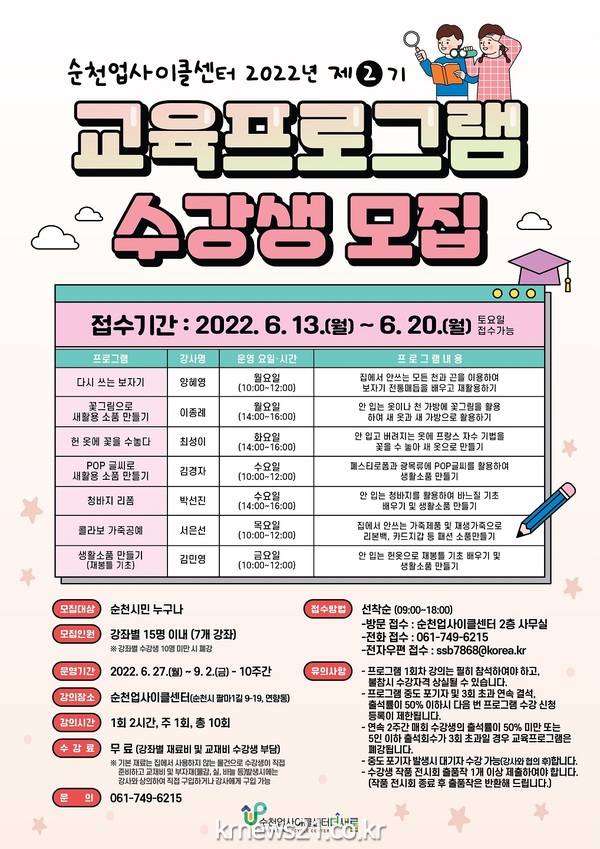 순천시는 업사이클 문화 확산과 시민의식 함양을 위해 ‘순천업사이클센터 더새롬’에서 버려지는 자원의 새활용과 재활용 활성화를 주제로 2022년 제2기 교육프로그램을 운영한다.