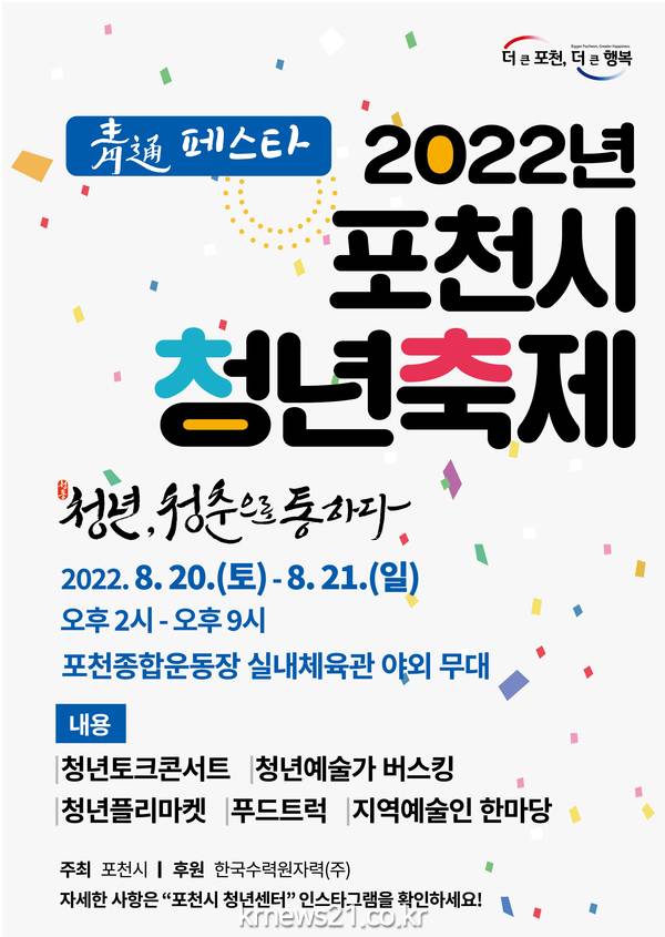포천시는 오는 8월 20일(토)~21일(일) 포천종합운동장 실내체육관 야외무대에서 2022년 포천시 청년축제 “靑通(청통) 페스타(청년, 청춘으로 통하다!)”를 개최한다.