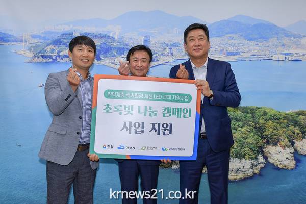 ▲ ▲ 17일 오전 시장실에서 정기명 여수시장, 김형일 한양 대표이사, 배준열 굿네이버스 광주전남지역본부장이 참석한 가운데 ‘여수 에너지 취약계층 LED교체 운영 사업비’ 전달식이 열렸다.시에 따르면 17일 오전 시장실에서 정기명 여수시장, 김형일 한양 대표이사, 배준열 굿네이버스 광주전남지역본부장이 참석한 가운데 ‘여수 에너지 취약계층 LED교체 운영 사업비’ 전달식이 열렸다.