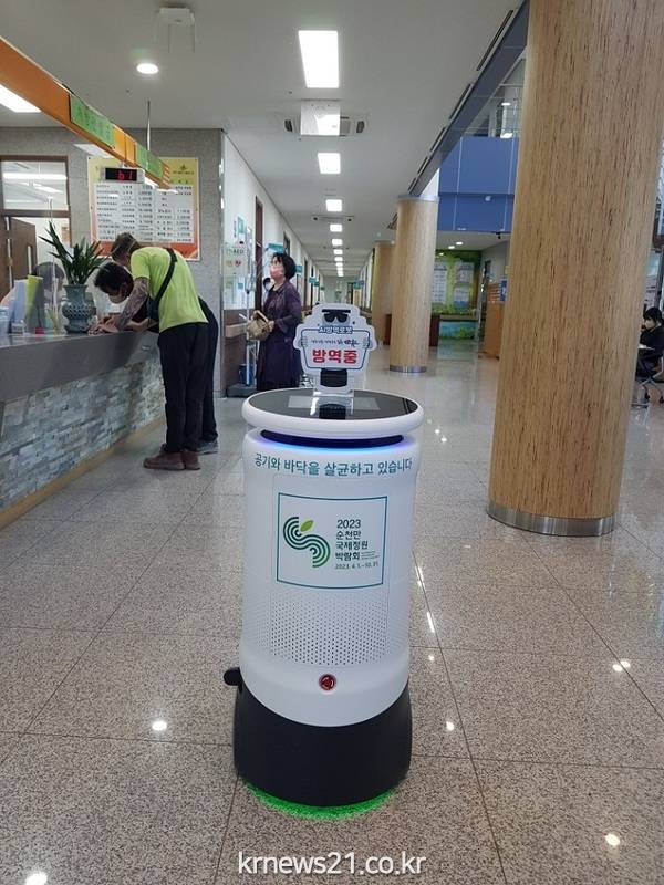 순천시(시장 노관규)는 인공지능(AI)과 최신 방역기술을 결합한 ‘AI 방역 로봇'을 보건소와 도서관(연향, 그림책)에 도입해 운영에 들어갔다고 21일 밝혔다.