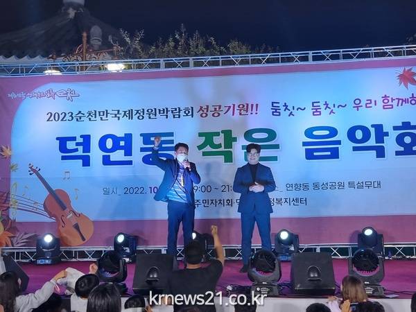 덕연동 작은음악회는 코로나19로 지쳐있던 시민을 위로하고 다 함께 2023순천만국제정원박람회의 성공 기원을 위해 마련한 자리로, 동성공원을 가득 메운 시민들의 하나 된 함성과 호응으로 가슴 벅찬 대화합의 장이었다.