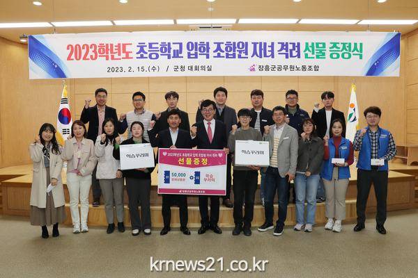 장흥군과 공무원노조는 15일 초등학교에 입학 예정인 자녀를 둔 조합원을 격려하는 자리를 가졌다.