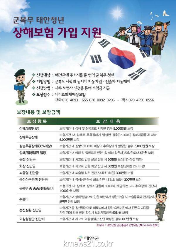 ▲ 태안군, ‘지역 청년 군생활 안전하게!’ 군복무 상해보험 지원태안군이 지역 청년들의 사회적 안전망 확보를 위해 현역 군복무자를 대상으로 상해보험을 지원한다.