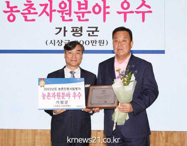 ▲ 가평군 농기센터, 농촌자원분야 우수기관 선정가평군 농업기술센터는 경기도농업기술원이 주최한 ‘2022년도 농촌진흥사업 평가’에서 농촌자원분야 우수기관으로 선정됐다고 31일 밝혔다.