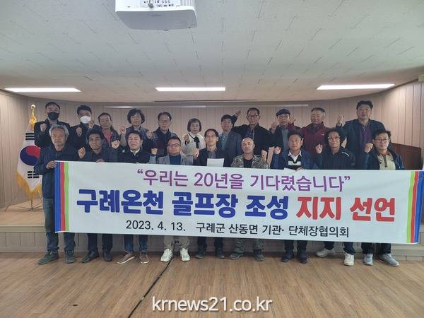 ▲ 구례군 산동면기관단체장협의회, 구례 온천 골프장 조성 지지 선언구례군 골프장 조성사업 대상지역의 기관단체장들이 골프장 조성 지지를 선언하고 나섰다.