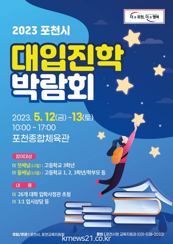 포천시는 오는 5월 12일부터 13일까지 관내 고등학생과 학부모 등을 위한 ‘2023년 포천시 대입진학박람회’를 포천종합체육관에서 개최한다.