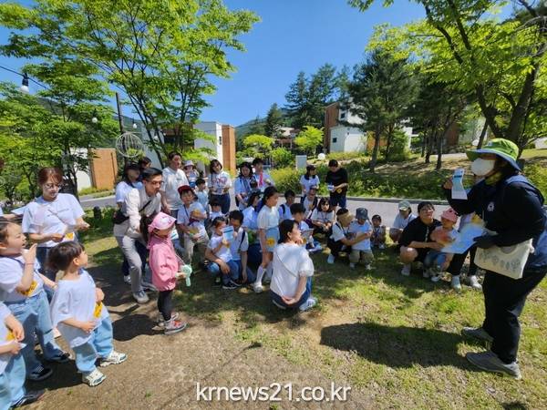 지난 3일 첫 수업에 참여한 비둘기어린이집 80여 명의 가족은 휴양림 숲길에서 탄소 먹는 나무를 찾아보고 솔방울 골프, 질경이 제기차기 등 게임에 참여하며 숲을 지키는 방법에 대해 함께 이야기해보는 의미 있는 시간을 가졌다.
