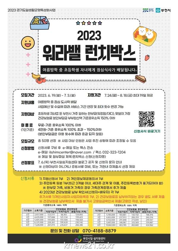 □ ‘2023 워라밸 런치박스’신청 대상은 건강보험료 본인부담금 부부합산액 기준 중위소득 150% 이하 가정의 초등학생 자녀를 둔 워킹부모(일하는 한부모·맞벌이 가정)이며, 부천시일쉼지원센터 블로그에서 신청서를 내려받아 증빙서류와 함께 이메일 또는 팩스로 제출하면 된다.