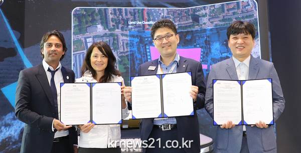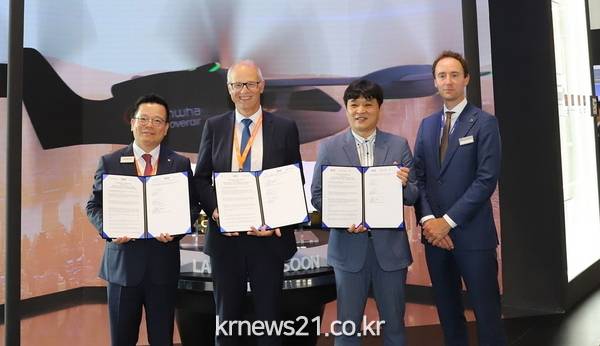 - (왼쪽부터) 어성철 한화시스템 대표이사, 마이클 피터(Michel Peters) NLR 대표, 정민철 한국공항공사 IAM사업단장, 행크 반 바이크(Henk van Dijk) NLR 항공우주 운영 담당 부사장
