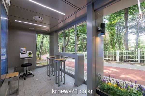 쉼터에서는 스마트폰 충전도 가능하고 주변 정보 표시와 힐링 음악 송출 등 다양한 편의 서비스도 제공한다.