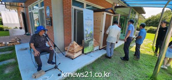 설종수 대표의 꿀벌 공기 호흡에 이용하는 장치와 방법 등 설명에 이어 에어컬럭터(공기흡입기계), 에어부스(이동식 통나무집) 공기캔 등 체험 행사로 이어졌다.
