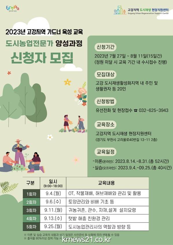 도시농업전문가에 관심 있는 고강지역 주민 및 부천시민 누구나 참여할 수 있으며, 추가 모집인원은 12명으로 선착순 전화 및 방문 접수한다.