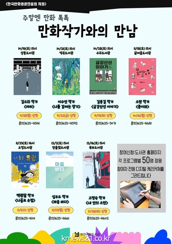 부천시립도서관에서는 ‘주말엔 만화 톡톡’이라는 주제로 오는 10월에서 12월까지 7개 시립도서관에서 만화작가와의 만남을 개최한다.