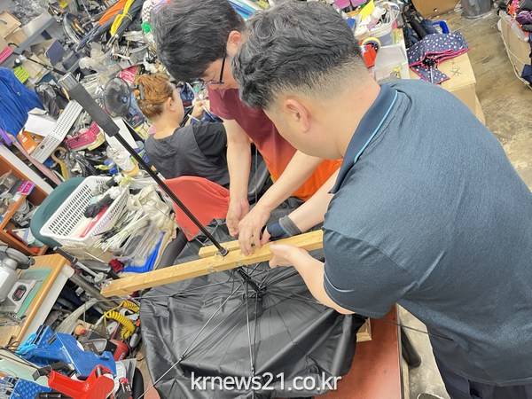 수원시가 ‘2024년 지역공동체일자리사업’으로 추진한 찾아가는 우산 수리센터’는 우산 수리 전문가에게 교육받은 지역공동체 일자리사업 참여자들이 4개 구를 순회하며 고장 난 우산을 무료로 고쳐주는 서비스다.