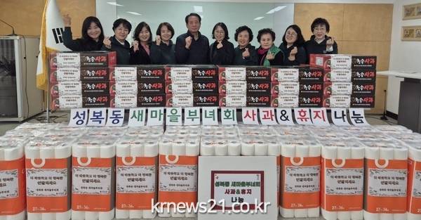 수지구 성복동 새마을부녀회는 9일 동절기를 맞아 생필품 꾸러미 31개를 지원했다. 36롤 휴지와 사과박스로 구성된 생필품 꾸러미는 저소득 가정 10가구와 경로당 21개소에 전달됐다.