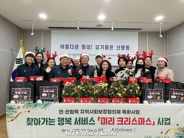 수지구 신봉동 지역사회보장협의체(위원장 김경순)는 10일 수지노인복지관과 함께 지역의 취약계층 12가구에 크리스마스 선물을 전달했다. 협의체는 수지노인복지관에서 후원한 성금으로 탁상용 크리스마스트리와 간식 꾸러미를 마련해 한부모 가정과 홀로 어르신 가구에 선물을 전달하고 안부를 살폈다.