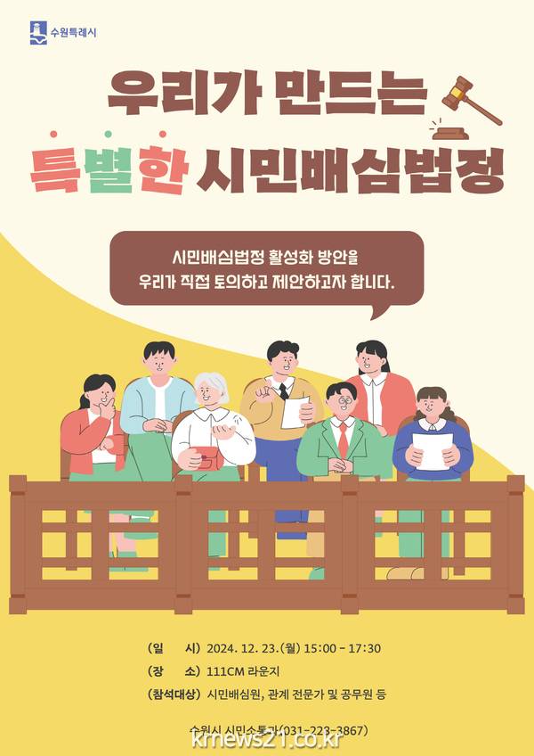 수원시(시장 이재준)가 23일 오후 3시 복합문화공간 111CM 라운지에서 ‘우리가 만드는 특별한 시민배심법정’을 개정하고, 시민배심법정 활성화 방안을 논의한다.