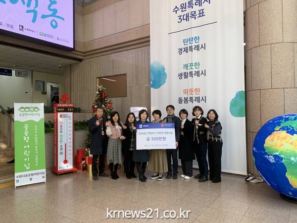 수원시 공공형어린이집연합회가 “학대 피해 아동의 심리치료에 사용해 달라”며 수원시에 성금 300만 원을 기부했다. 전달식은 18일 수원시청 본관에 설치된 사랑의 온도탑 앞에서 열렸다.