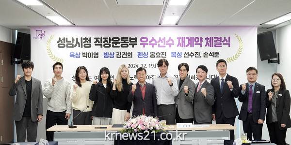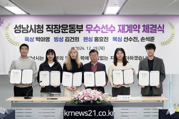 성남시는 국내외 대회에서 선전한 시청 직장운동부 소속 5명의 선수와 재계약을 체결했다고 19일 밝혔다.