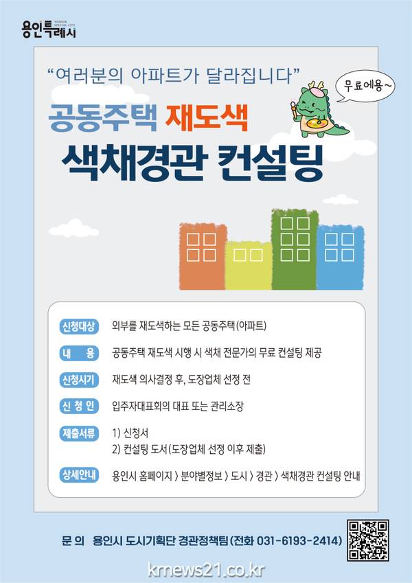 용인특례시(시장 이상일)는 지역 내 596개 모든 공동주택 단지를 대상으로 외벽을 재도색할 때 색채 전문가가 무료로 컨설팅을 해준다고 14일 밝혔다.