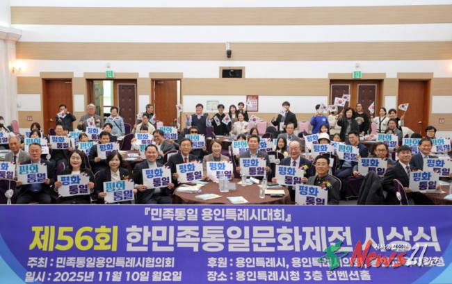 용인특례시(시장 이상일)는 10일 시청 컨벤션홀에서 민족통일 용인특례시협의회 주관으로 ‘민족통일 용인특례시대회와 제56회 한민족통일문화제전 시상식’이 열렸다고 밝혔다. 이날 행사는 한반도의 평화와 통일을 주제로 한 글짓기·웹툰·포스터·사진 공모전의 입상작을 시상하고, 유공회원에게 표창을 수여하고자 마련됐다. 민...