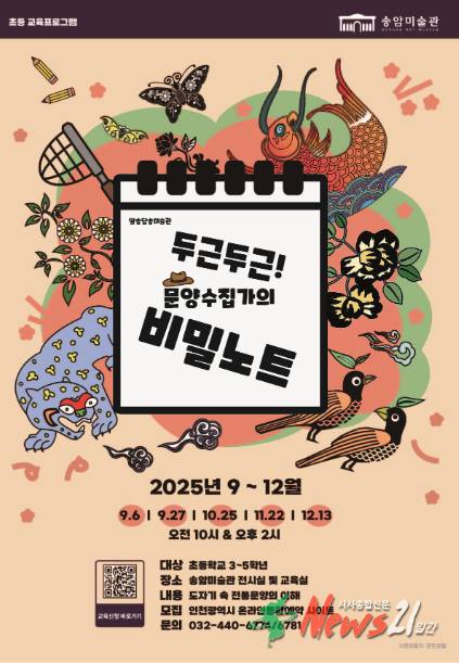 인천광역시(시장 유정복) 송암미술관은 오는 11월 22일 초등학교 3~5학년을 대상으로 미술관 체험 교육프로그램 ‘두근두근! 문양수집가의 비밀노트’를 운영한다고 밝혔다.이번 프로그램은 도자기와 민화에 담긴 전통 문양을 주제로 전시 관람, 활동지 학습, 체험을 결합한 참여형 교육으로 구성돼 어린이들이 전통미술을 보다 쉽고 흥미롭...