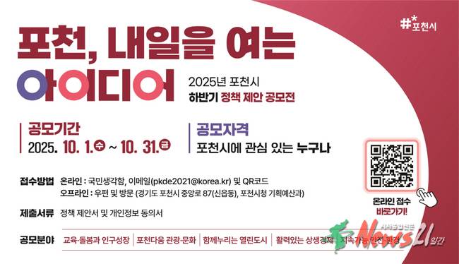 포천시 관계자는 “이번 정책 제안 공모전은 시민이 시정의 주체로 직접 참여하는 뜻깊은 기회”라며, “작은 아이디어 하나가 포천의 미래를 바꾸는 씨앗이 될 수 있는 만큼, 많은 시민들의 적극적인 참여를 바란다”고 말했다.