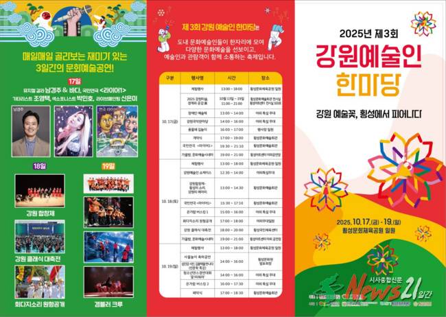 강원예술인과 도민의 화합·소통·공감을 위한 「2025 제3회 강원예술인 한마당」 행사가 오는 10월 17일부터 19일까지 3일간 횡성문화체육공원 일원에서 열린다.