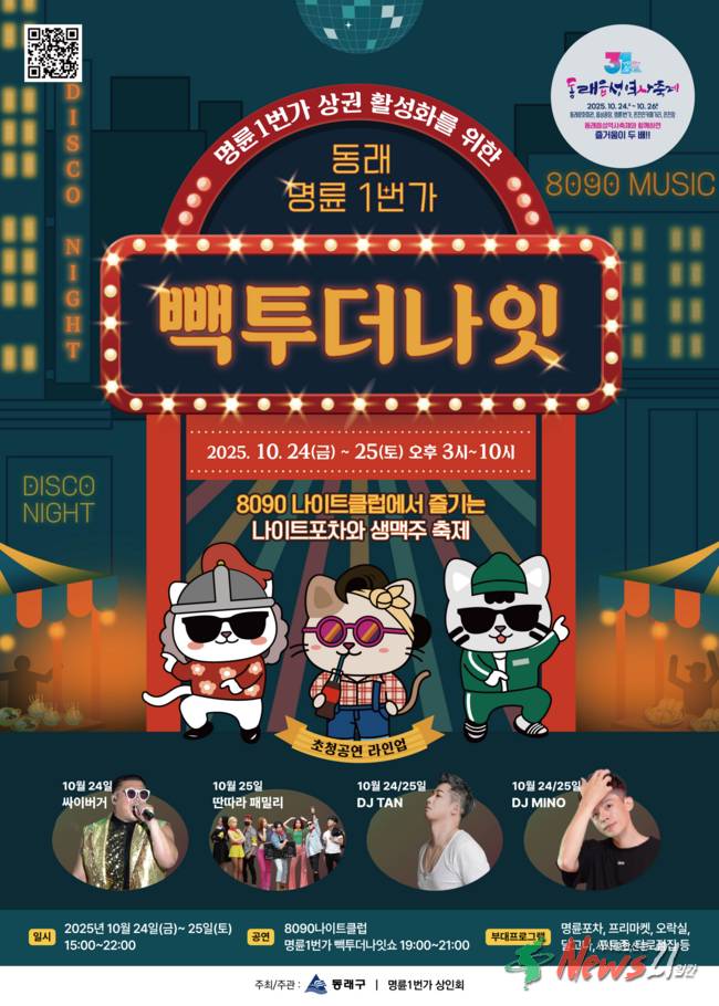 부산 동래구(구청장 장준용)는 오는 10월 24일(금)부터 25일(토)까지 이틀간 오후 3시부터 10시까지 명륜1번가 일대에서 ‘명륜1번가 나이트 페스티벌(빽투더나잇)’을 개최한다고 밝혔다.