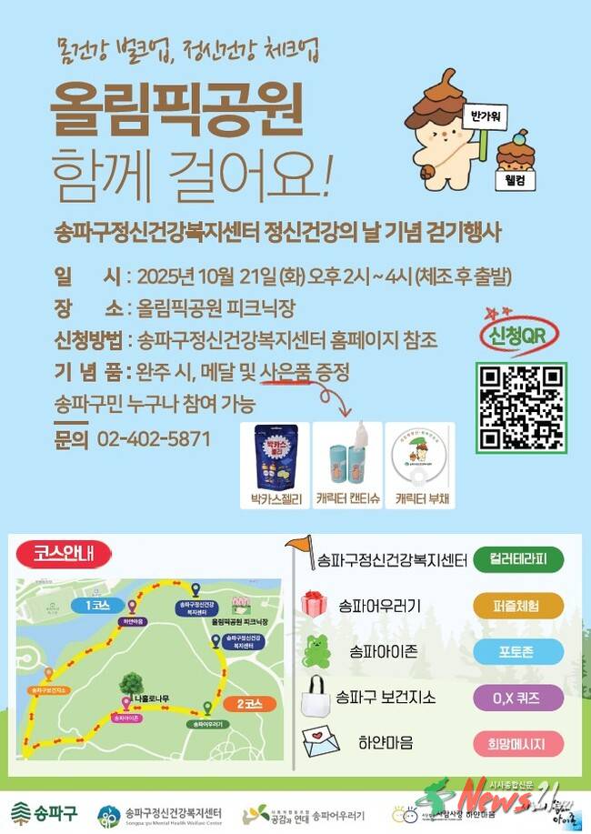 완연한 가을을 맞아, 서울 송파구(구청장 서강석)가 오는 21일 오후 2시 올림픽공원 일대에서 정신건강의 날 기념 걷기 행사 ‘몸건강 벌크업, 정신건강 체크업’을 개최한다고 알렸다.