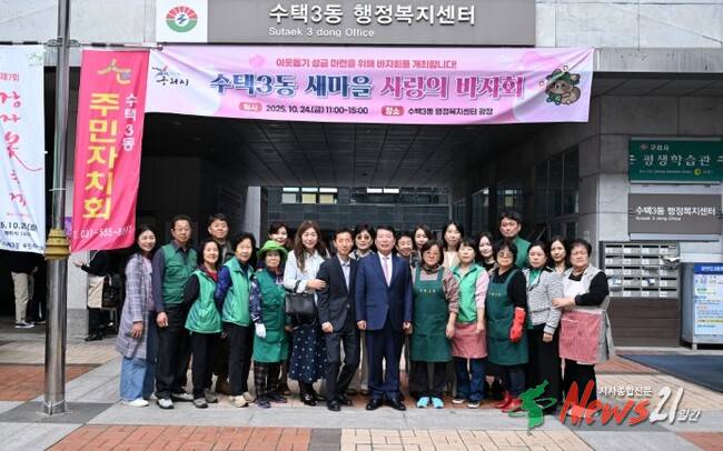 구리시(시장 백경현) 수택3동 새마을부녀회(회장 최영숙)는 지난 10월 24일, 수택3동 행정복지센터 광장에서 이웃돕기 성금 모금을 위한 ‘사랑의 바자회’를 성황리에 개최했다.이번 바자회는 점심 식사와 각종 먹거리와 물품 판매, 불우이웃 성금 모금 등으로 구성되어 수택3동 지역 주민, 각 동 기간단체 회원, 관내 관계기관 관계자, 공무원 등 150여 명이 참여해 활기찬 분위기 속에서 진행됐다.행사 현장에서는 이웃돕기 성금 모금과 함께 참기름, 들기름, 다시마, 참깨 등 다양한 먹거리 판매가 이뤄졌으며, 판매 수익금과 이웃돕기 성금은 지역 내 소외된 이웃을 돕는 데 사용될 예정이다.백경현 구리시장은 “쌀쌀한 날씨에도 따뜻한 마음으로 바자회를 준비해 주신 수택3동 새마을부녀회와 새마을지도자회 관계자분들께 깊이 감사드린다”라며, “이번 수택3동 사랑의 바자회 덕분에 우리 주민들이 다가오는 겨울을 좀 더 따뜻하게 보낼 수 있도록 기원한다”라고 말했다.수택3동 행정복지센터 홍종민 동장은 “우리 동 사랑의 바자회가 성황을 이뤄 기쁘고, 바쁘신 와중에도 참석하여 자리를 빛내주신 모든 분께 진심으로 감사의 말씀을 드린다”라며, “새마을부녀회의 선한 영향력이 지역사회에 널리 퍼지도록 앞으로도 적극 돕겠다”라고 전했다.