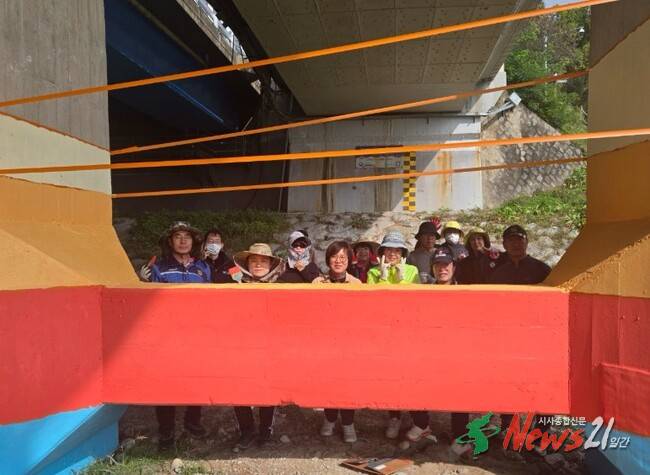 ▲ 사진=여주시여주시 오학동 주민자치회(회장 심무순)는 10월 26일 여주대교 하단 오학방면 기둥 일대에서 지역의 미관을 개선하고 시민들에게 쾌적한 환경 제공을 위해 벽화 봉사활동을 실시하였다.