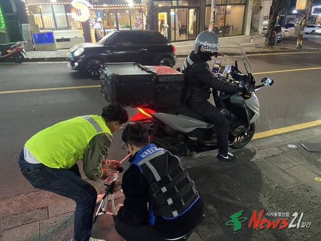 서귀포시와 교통안전공단, 자치경찰단과 서귀포경찰서로 구성된 합동단속반은 불법튜닝(안개등 임의 설치) 1건, 안전기준 위반(등화장치, 번호등 미점등) 5건, 의무보험 미가입 운행 2건 등 불법 이륜차 총 8건을 적발하고 소음점검 16건을 실시했다.
